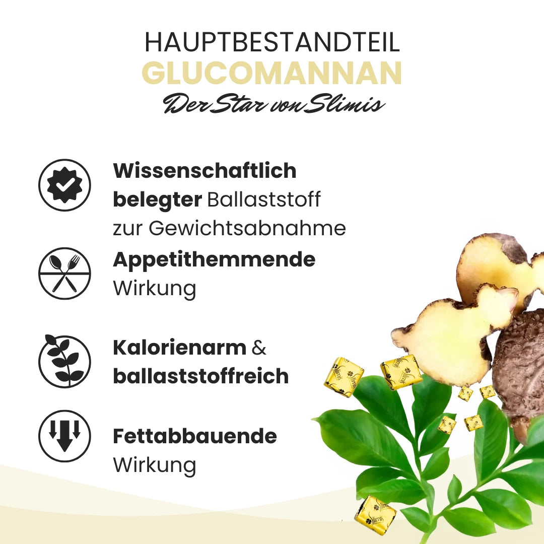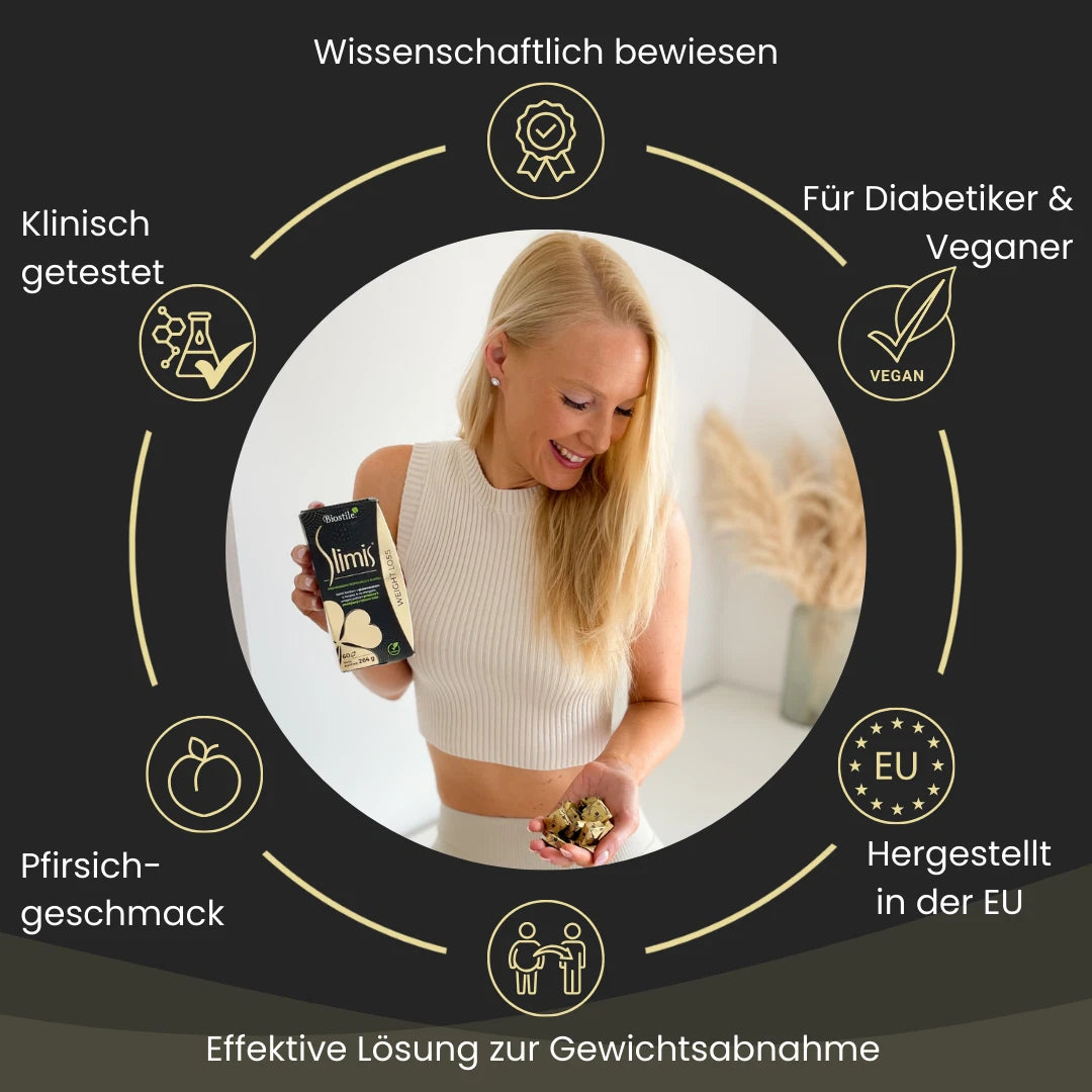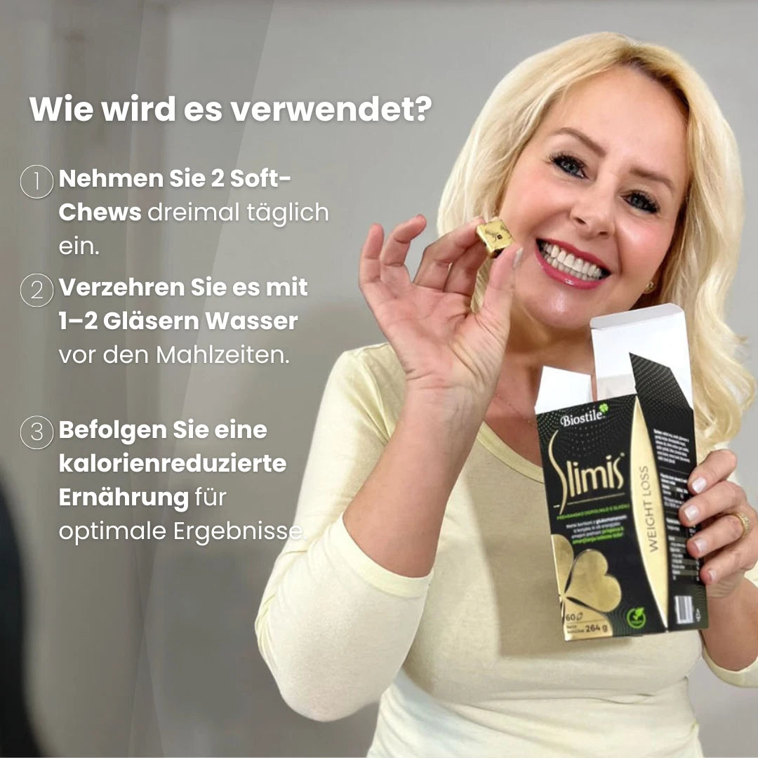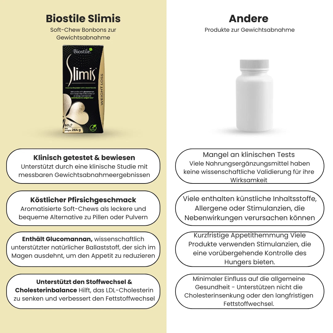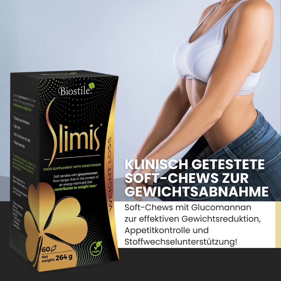 Slimis Biostile ist ein Nahrungsergänzungsmittel in Form von weichen Süßigkeiten, das Glucomanan enthält und helfen soll, das Körpergewicht zu reduzieren.