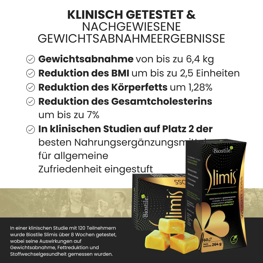 Slimis hilft, bis zu 6 kg Gewicht zu verlieren, unterstützt durch die Ergebnisse einer klinischen Studie, die 2022 an 120 Personen durchgeführt wurde. In dieser Studie untersuchten die Forscher die Auswirkungen von fünf Nahrungsergänzungsmitteln, einschließlich Slimis, in Kombination mit einer restriktiven Diät auf das metabolische Syndrom bei übergewichtigen und fettleibigen Erwachsenen. Die Ergebnisse zeigen, dass die Verwendung von Slimis zu einer Abnahme des Bauchfetts um das bis zu 6,3-fache und des Körperfettindex um bis zu 2,5 Einheiten beigetragen hat. Darüber hinaus wird erwartet, dass Slimis den Cholesterinspiegel um bis zu 7% senkt.